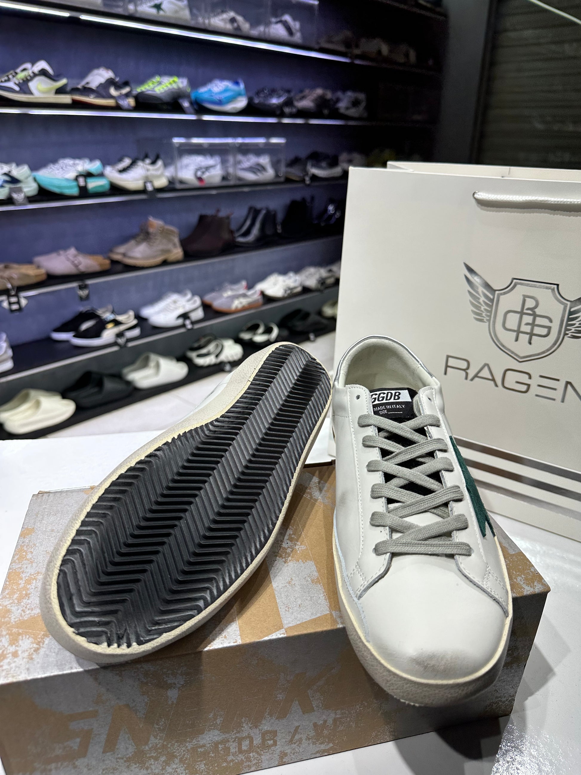 Upgrade your sneaker game with the Golden Goose Superstar x Green Suede star. This high-end shoe features a unique green suede star, adding a touch of luxury to your look. Made with top-quality materials, these sneakers are sure to elevate any outfit. Don't miss out on this stylish and sophisticated footwear.